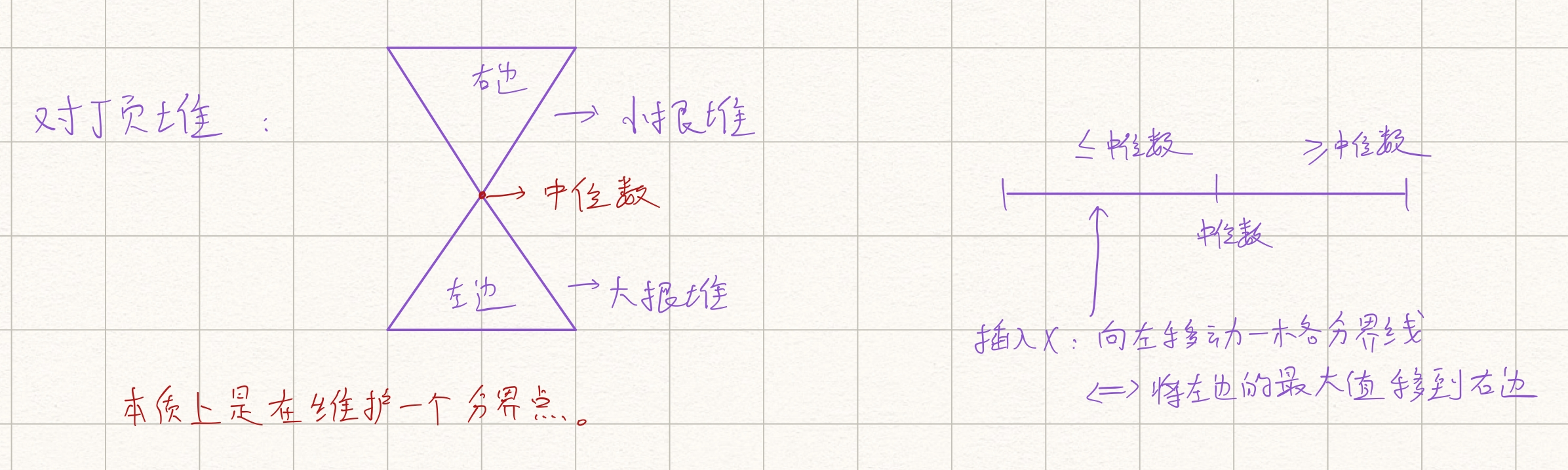 if (down.empty() || x <= down.top()) down.push(x); //下面为空或x小于下方堆顶,则将x插入大根堆