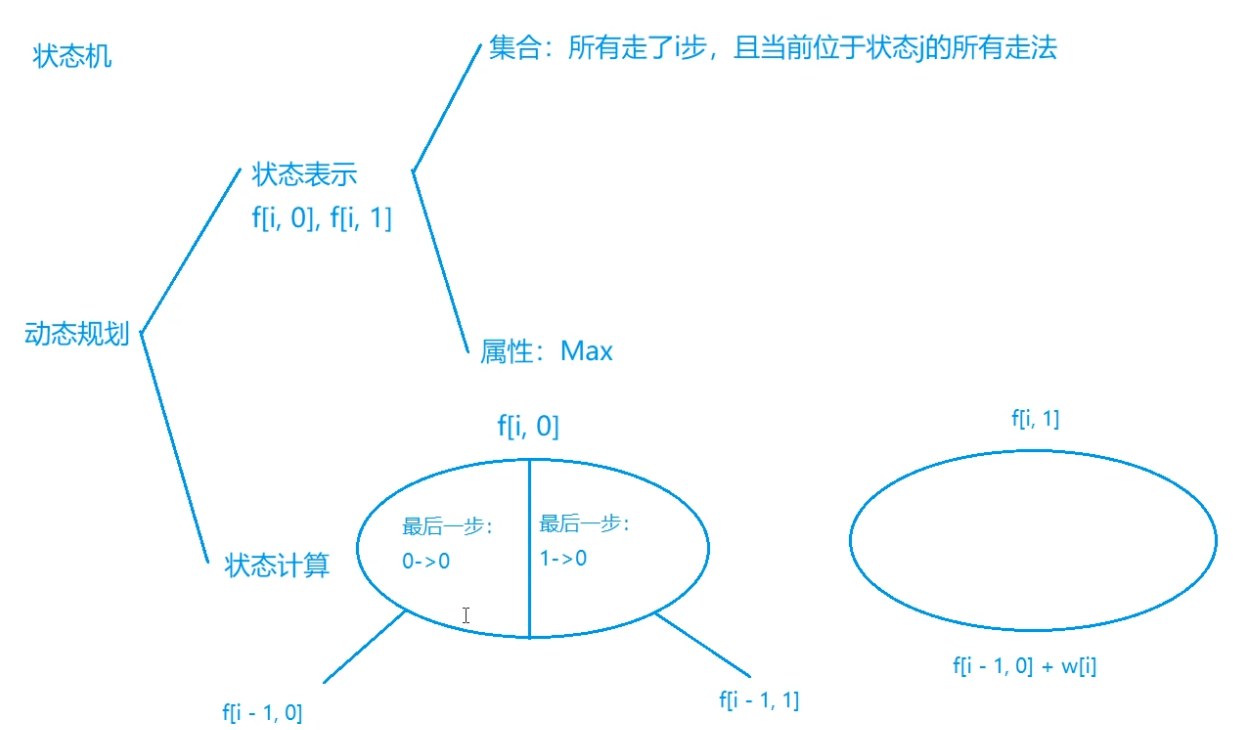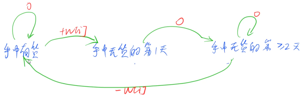 换成01那种状态之间的转化图来看的话, 01背包中0和1的转化不受任何约束,可以说是有向完全图;但是状态机不一样,由于某些条件下的边不存在,于是我们 在计算本次状态之前可能需要了解前一次的状态 ,于是需要状态细分标记